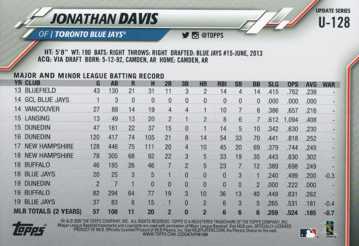 U-128 Jonathan Davis Toronto Blue Jays 2020 Topps Update Baseball Card