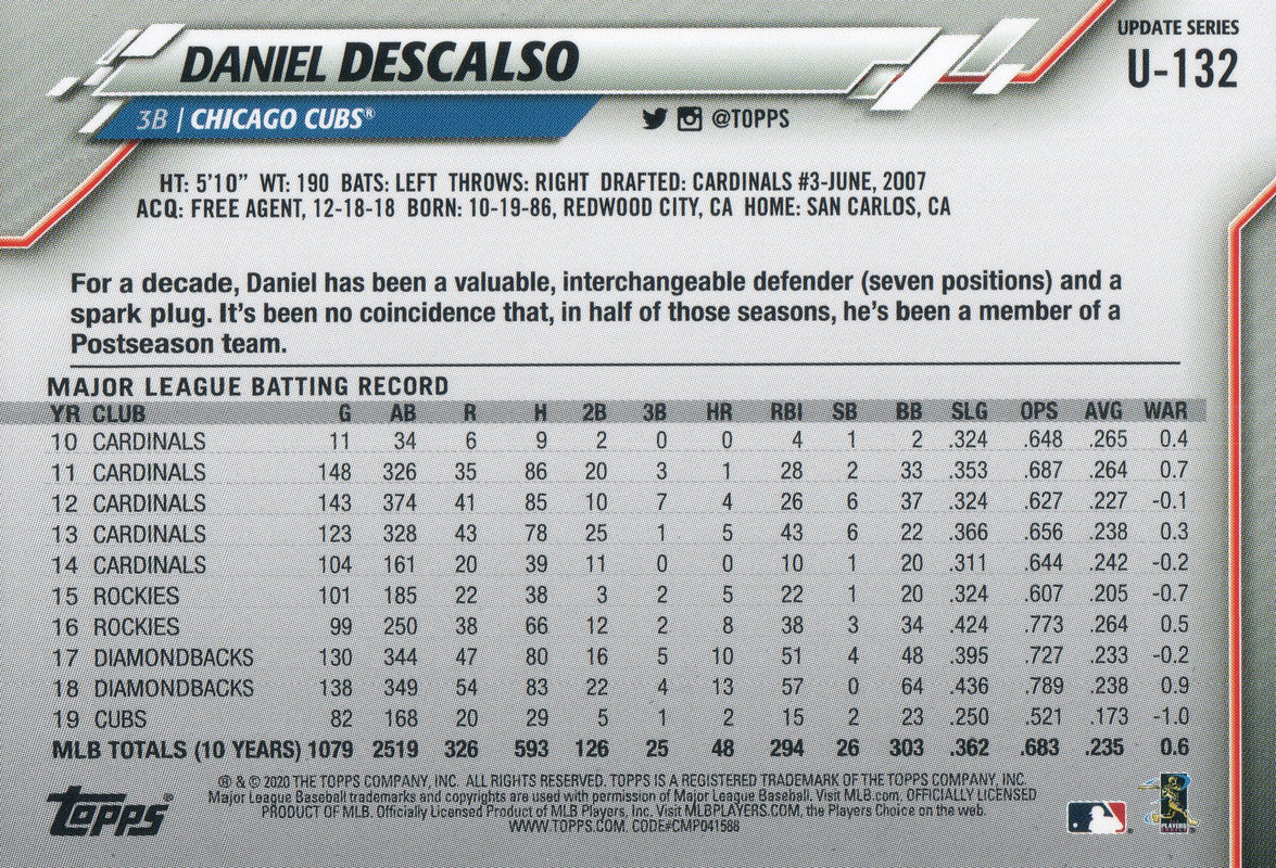 U-132 Daniel Descalso Chicago Cubs 2020 Topps Update Baseball Card