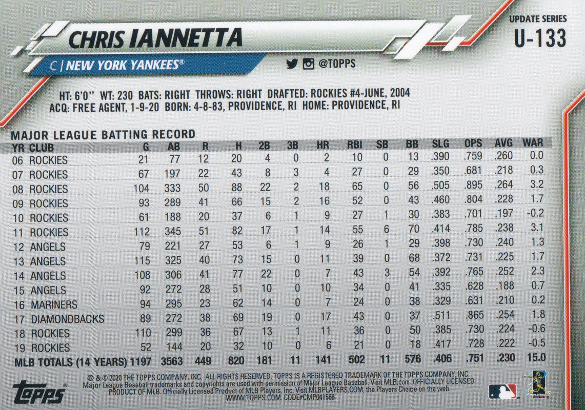 U-133 Chris Iannetta New York Yankees 2020 Topps Update Baseball Card