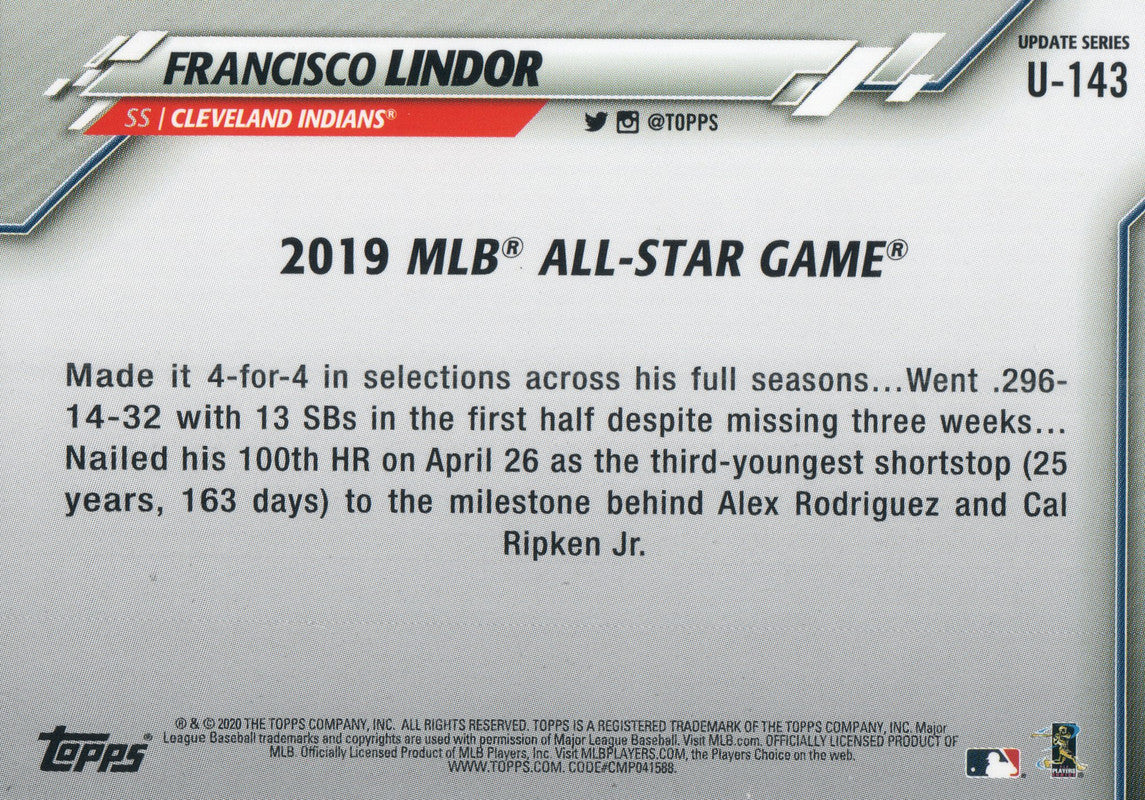 U-143 Francisco Lindor 2019 MLB All Star Game Cleveland Indians 2020 Topps Update Baseball Card