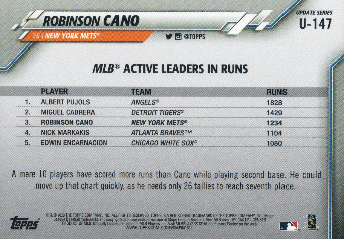U-147 Robinson Cano MLB Active Leaders New York Mets 2020 Topps Update Baseball Card