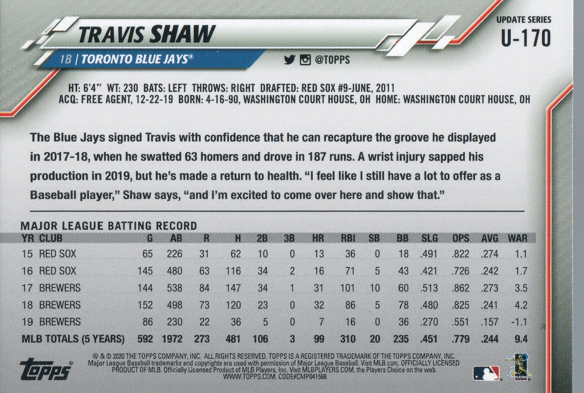 U-170 Travis Shaw Toronto Blue Jays 2020 Topps Update Baseball Card