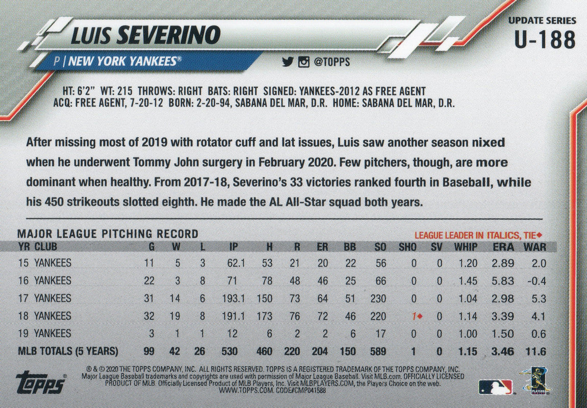 U-188 Luis Severino New York Yankees 2020 Topps Update Baseball Card