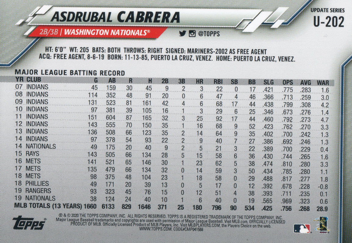 U-202 Asdrubal Cabrera Washington Nationals 2020 Topps Update Baseball Card