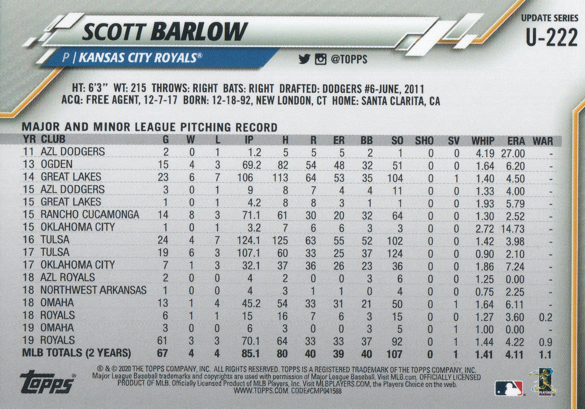 U-222 Scott Barlow Kansas City Royals 2020 Topps Update Baseball Card