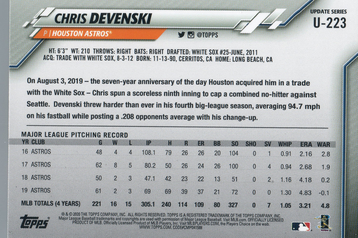 U-223 Chris Devenski Houston Astros 2020 Topps Update Baseball Card