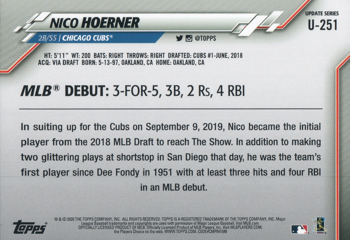 U-251 Nico Hoerner Rookie Chicago Cubs 2020 Topps Update Baseball Card