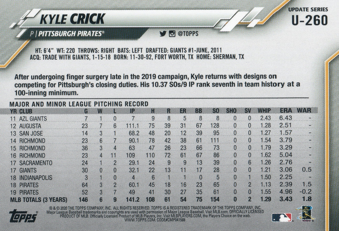 U-260 Kyle Crick Pittsburgh Pirates 2020 Topps Update Baseball Card