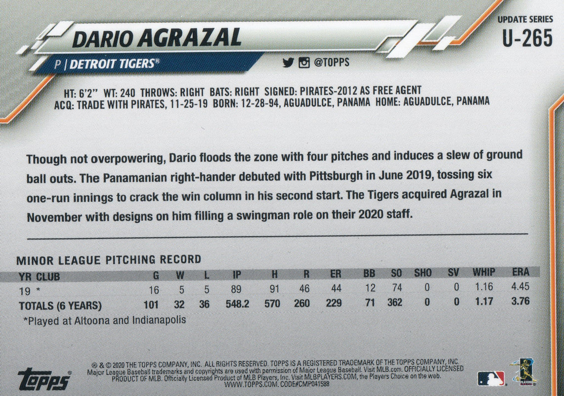 U-265 Dario Agrazal Rookie Detroit Tigers 2020 Topps Update Baseball Card