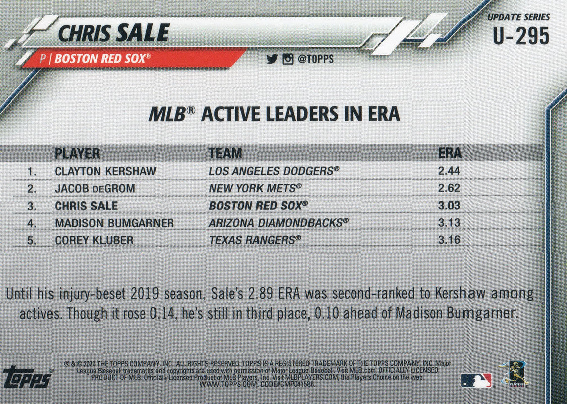 U-295 Chris Sale MLB Active Leaders Boston Red Sox 2020 Topps Update Baseball Card