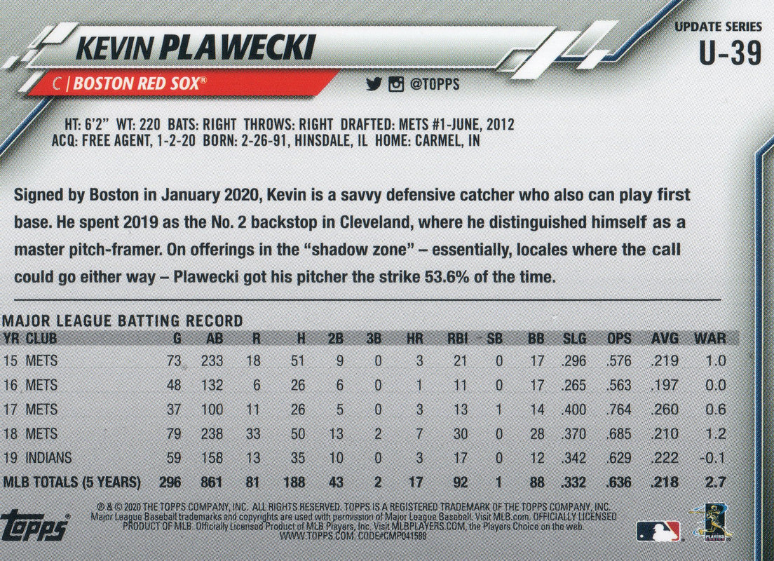 U-39 Kevin Plawecki Boston Red Sox 2020 Topps Update Baseball Card