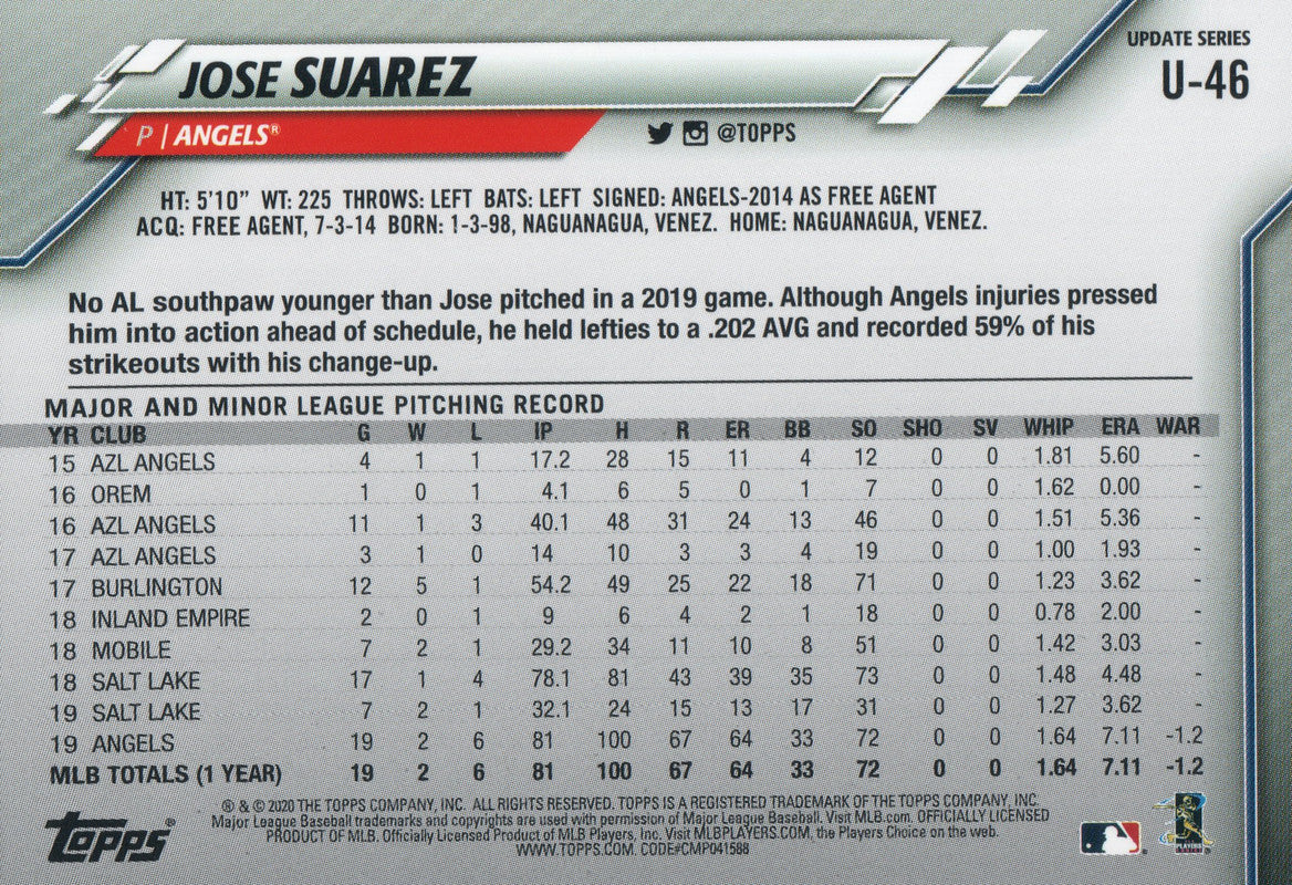 U-46 Jose Suarez Los Angeles Angels 2020 Topps Update Baseball Card