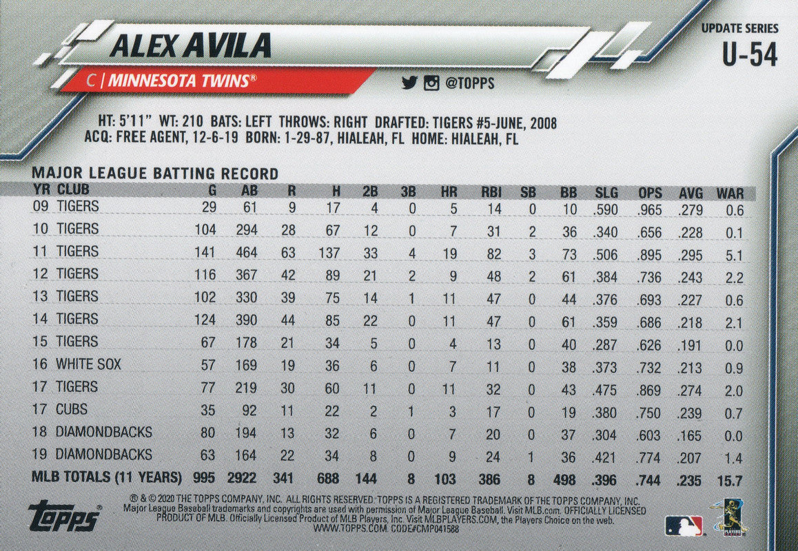 U-54 Alex Avila Minnesota Twins 2020 Topps Update Baseball Card