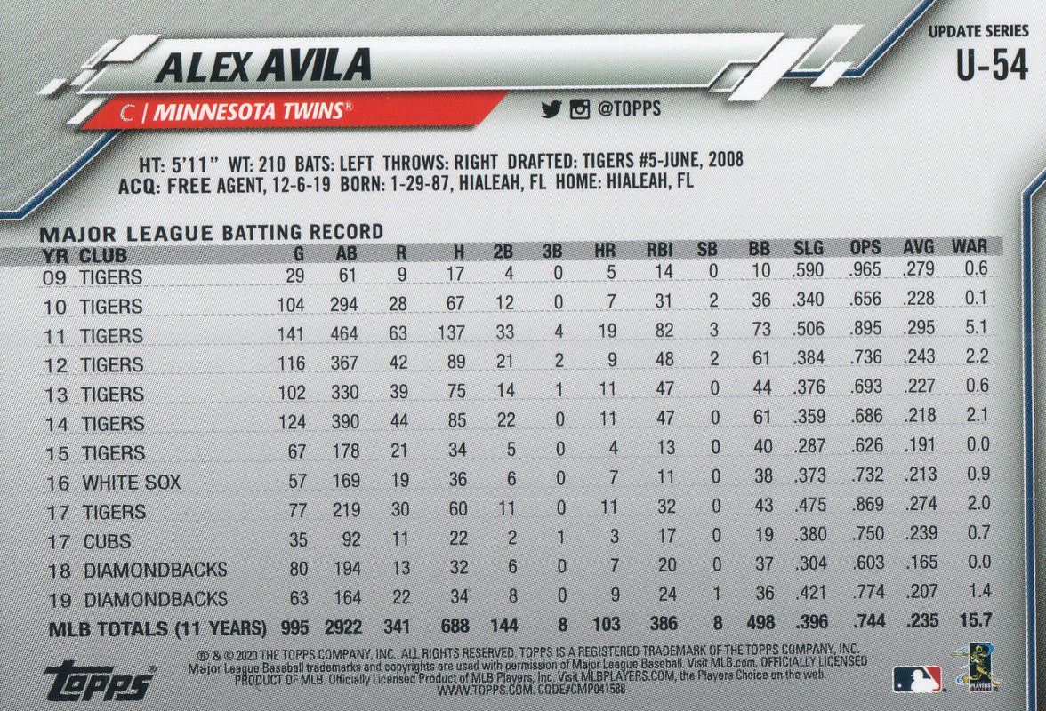 U-54 Alex Avila Minnesota Twins 2020 Topps Update Baseball Card