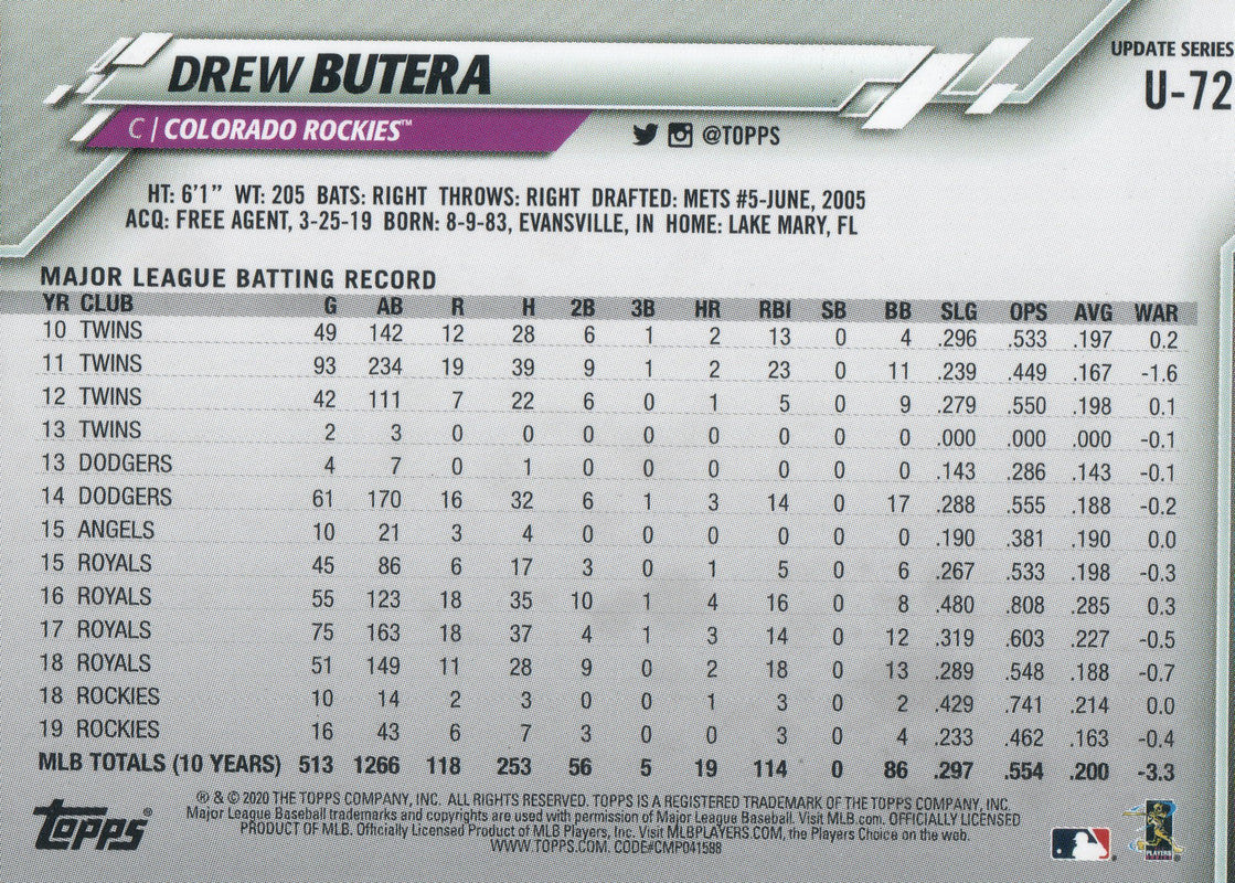 U-72 Drew Butera Colorado Rockies 2020 Topps Update Baseball Card