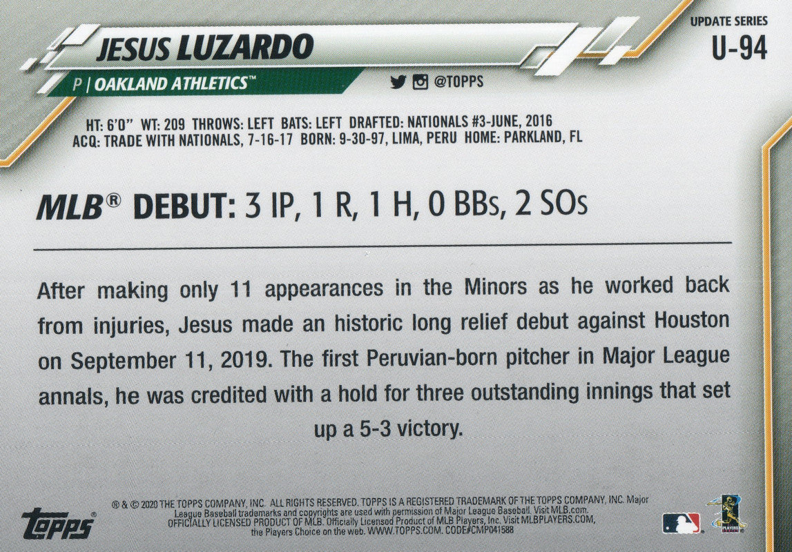 U-94 Jesus Luzardo Rookie Oakland Athletics 2020 Topps Update Baseball Card