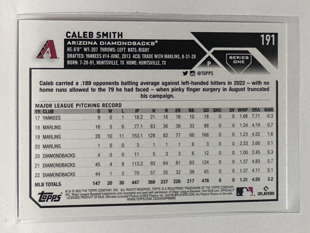 #191 Caleb Smith Arizona Diamondbacks 2023 Topps Series One Baseball Card