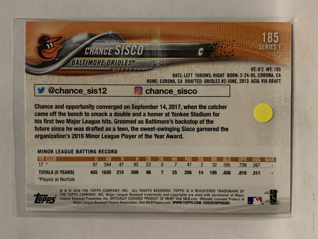 #185 Chance Sisco Rookie Baltimore Orioles 2018 Topps Series One Baseball Card