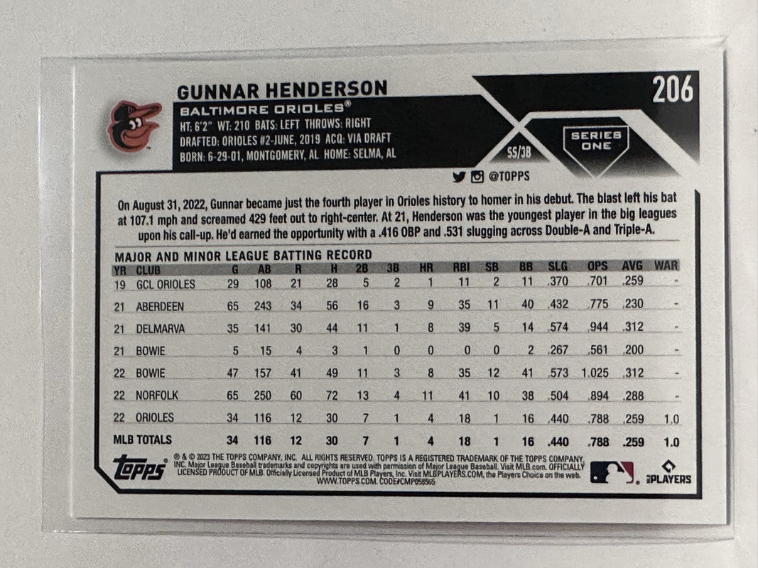 #206 Gunnar Henderson Rookie Baltimore Orioles 2023 Topps Series One Baseball Card
