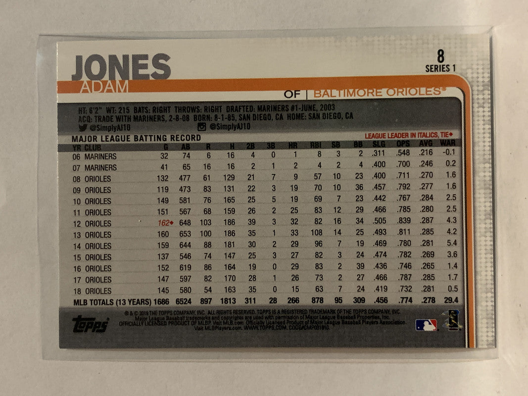 #8 Adam Jones Baltimore Orioles 2019 Topps Series One Baseball Card