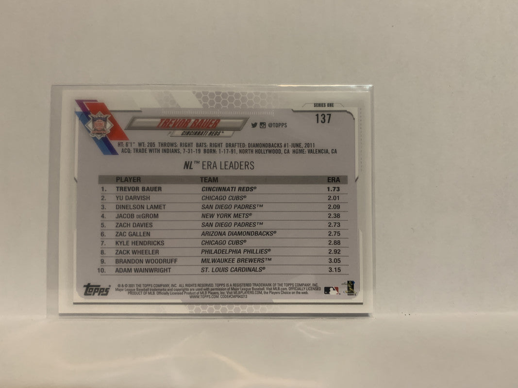 #137 Trevor Bauer League Leaders Cincinnati Reds 2021 Topps Series One Baseball Card