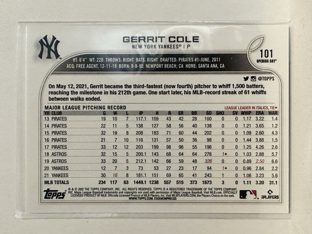 #101 Gerrit Cole New York Yankees 2022 Topps Opening Day Baseball Card