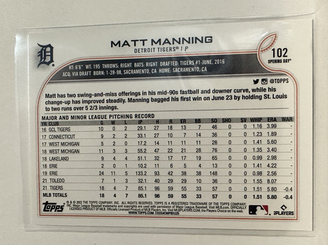 #102 Matt Manning Rookie Detroit Tigers 2022 Topps Opening Day Baseball Card