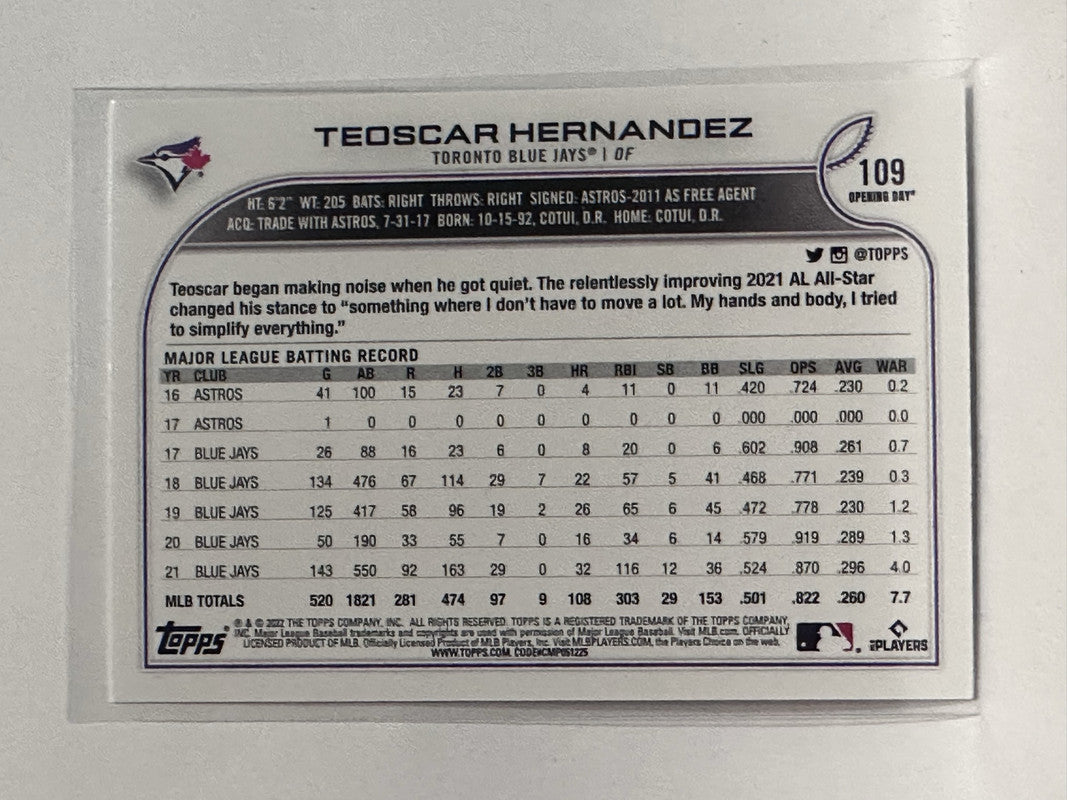 #109 Teoscar Hernandez Toronto Blue Jays 2022 Topps Opening Day Baseball Card