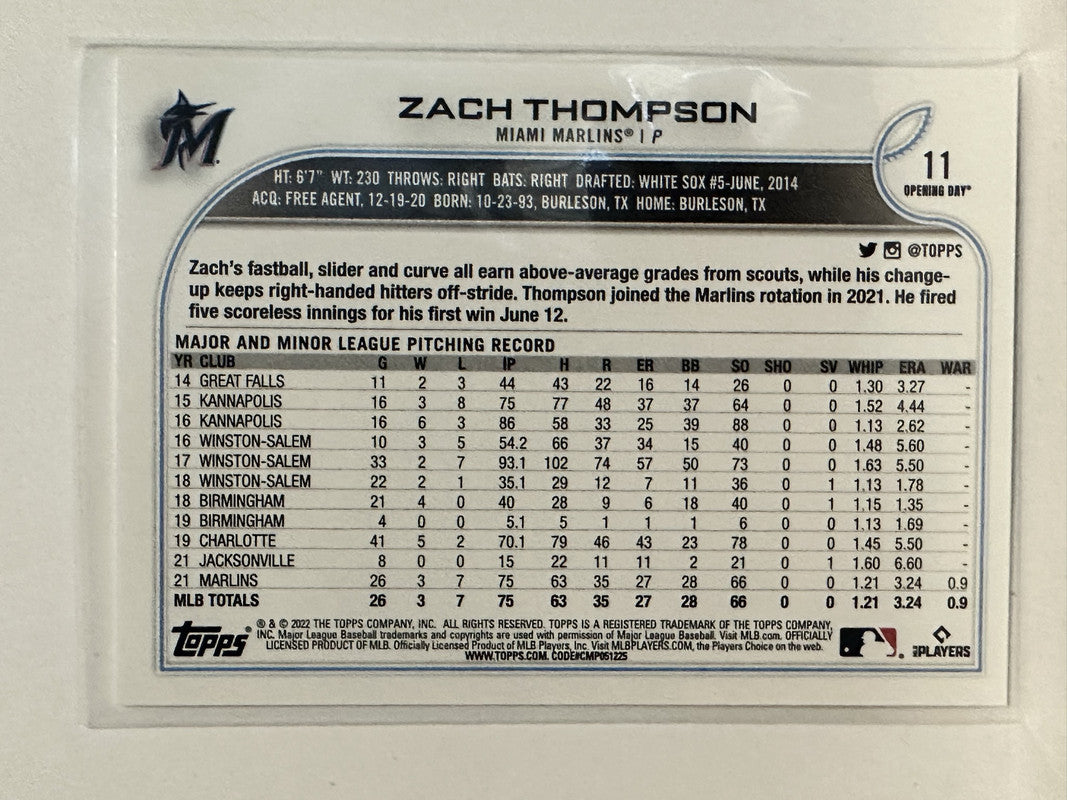 #11 Zach Thompson Rookie Miami Marlins 2022 Topps Opening Day Baseball Card