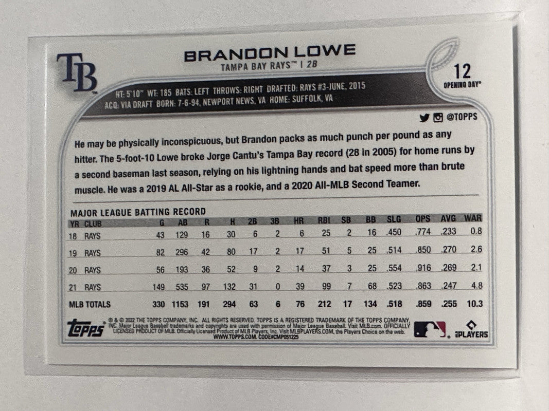 #12 Brandon Lowe Tampa Bay Rays 2022 Topps Opening Day Baseball Card