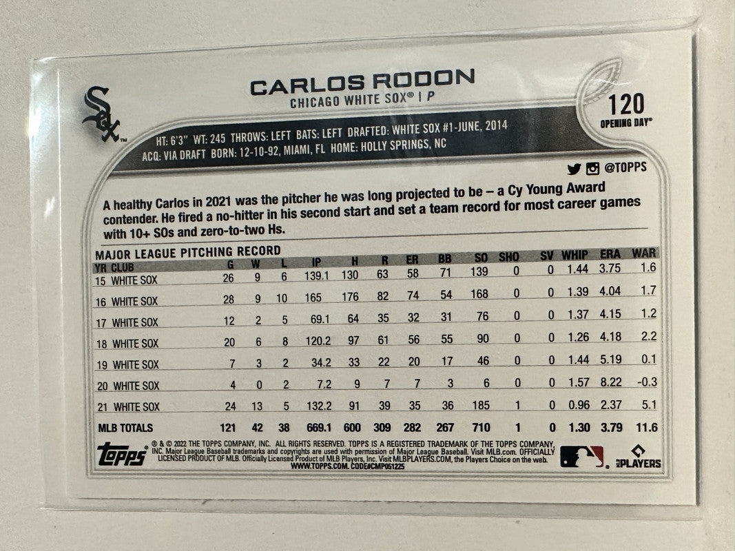 #120 Carlos Rodon Chicago White Sox 2022 Topps Opening Day Baseball Card