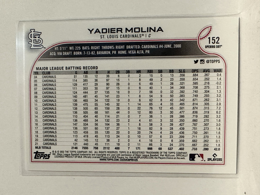 #152 Yadier Molina St Louis Cardinals 2022 Topps Opening Day Baseball Card