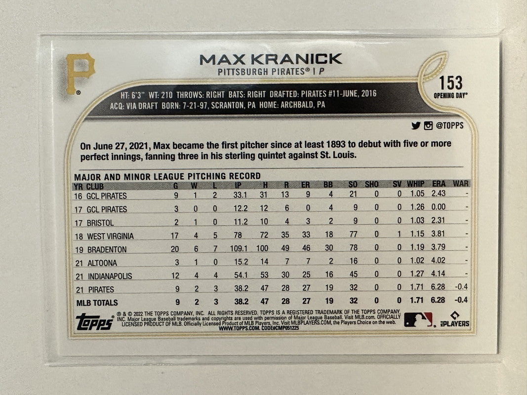 #153 Max Kranick Rookie Pittsburgh Pirates 2022 Topps Opening Day Baseball Card