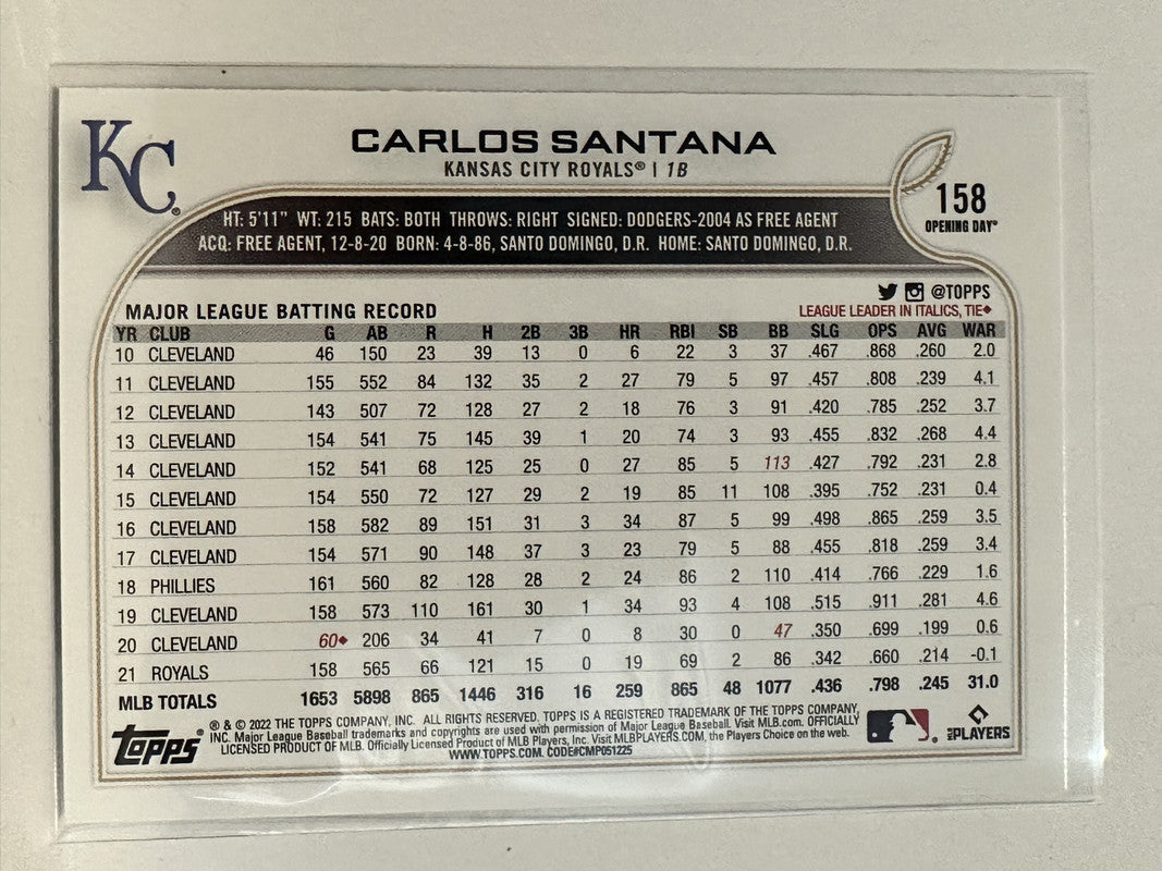 #158 Carlos Santana Kansas City Royals 2022 Topps Opening Day Baseball Card