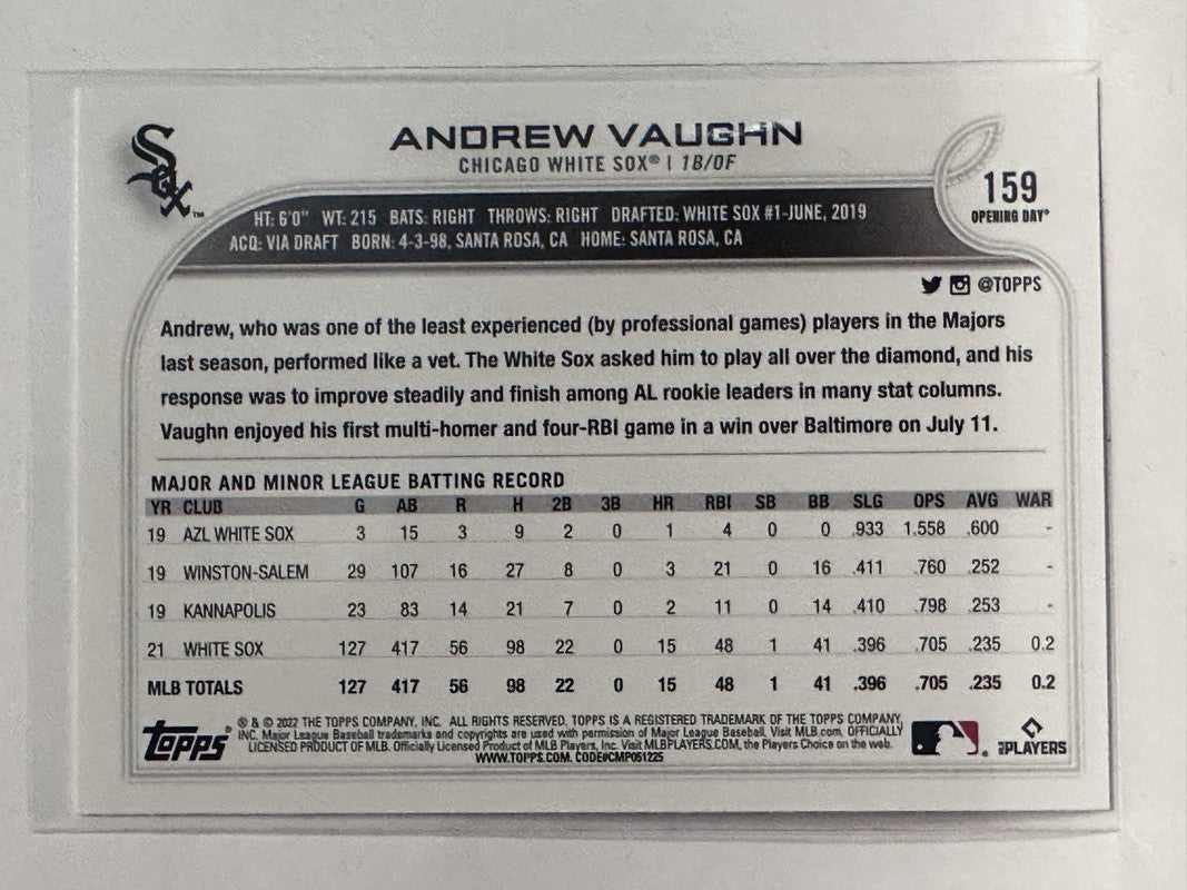 #159 Andrew Vaughn Future Stars Chicago White Sox 2022 Topps Opening Day Baseball Card