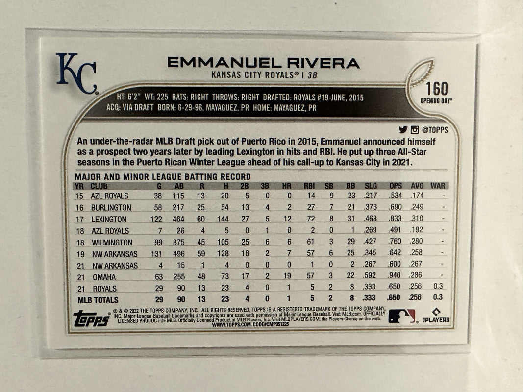 #160 Emmanuel Rivera Rookie Kansas City Royals 2022 Topps Opening Day Baseball Card
