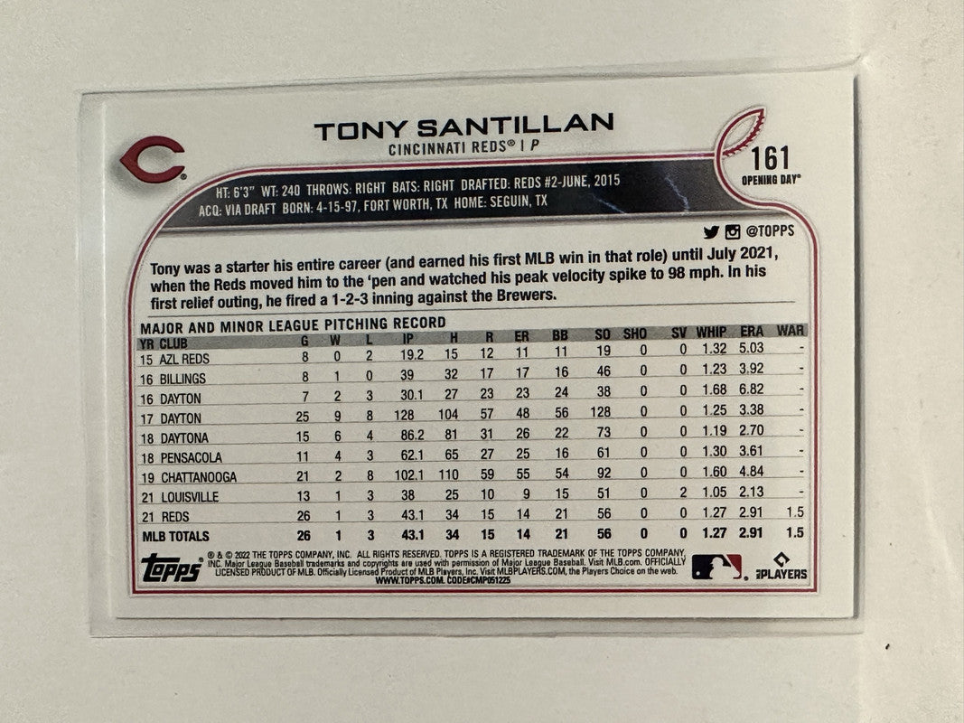 #161 Tony Santillan Rookie Cincinnati Reds 2022 Topps Opening Day Baseball Card