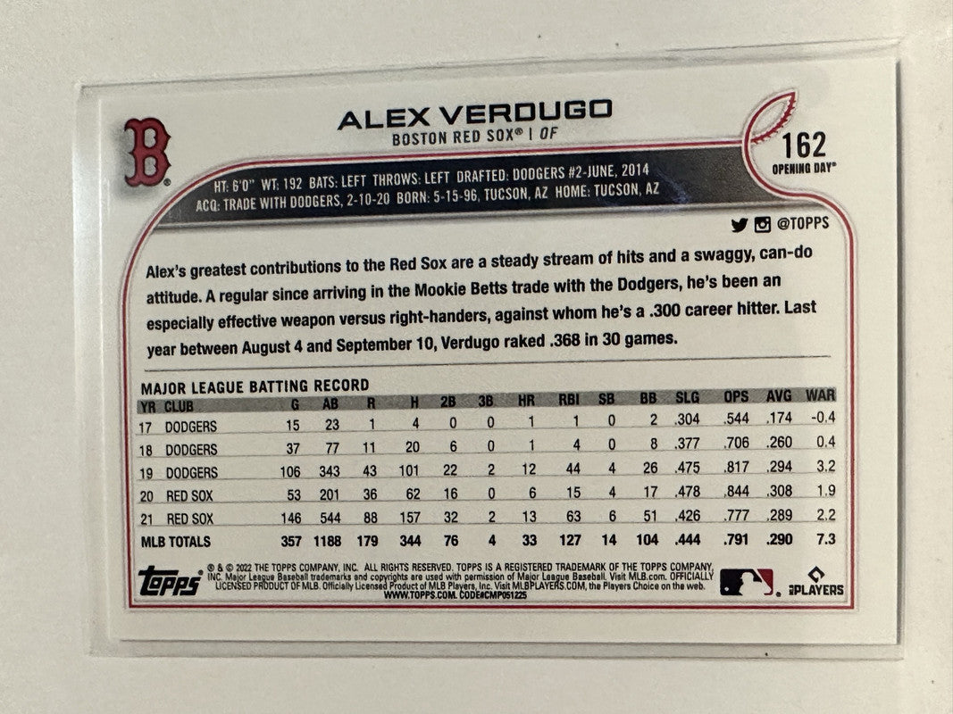 #162 Alex Verdugo Boston Red Sox 2022 Topps Opening Day Baseball Card