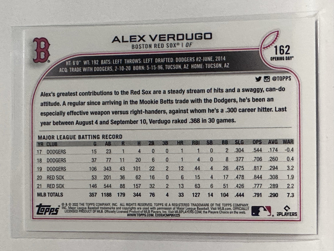 #162 Alex Verdugo Boston Red Sox 2022 Topps Opening Day Baseball Card