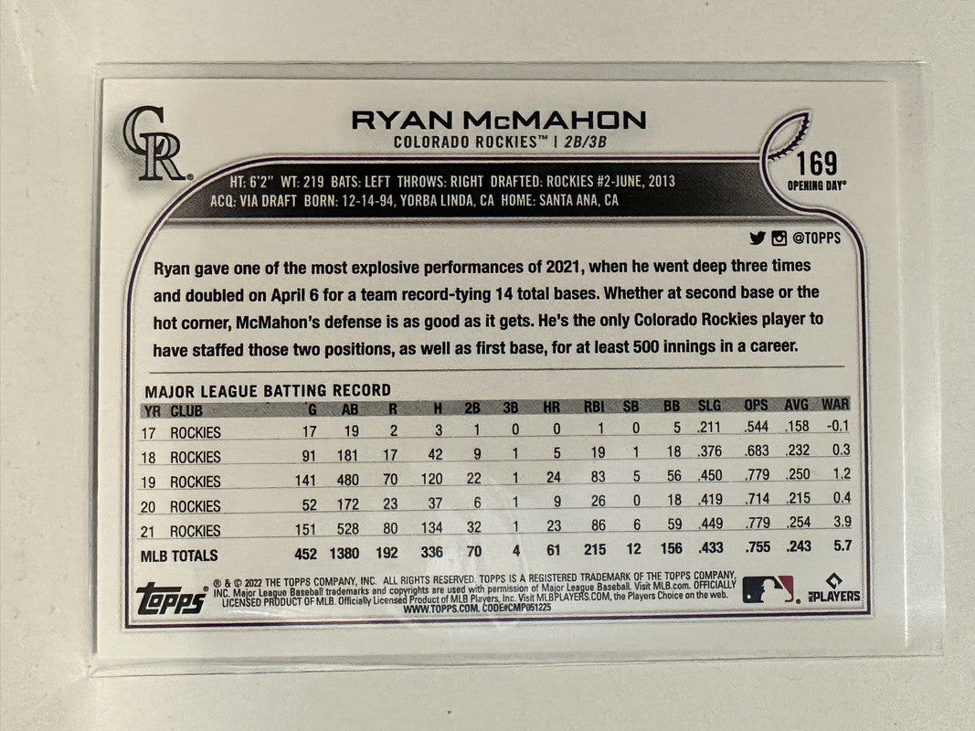 #169 Ryan McMahon Colorado Rockies 2022 Topps Opening Day Baseball Card
