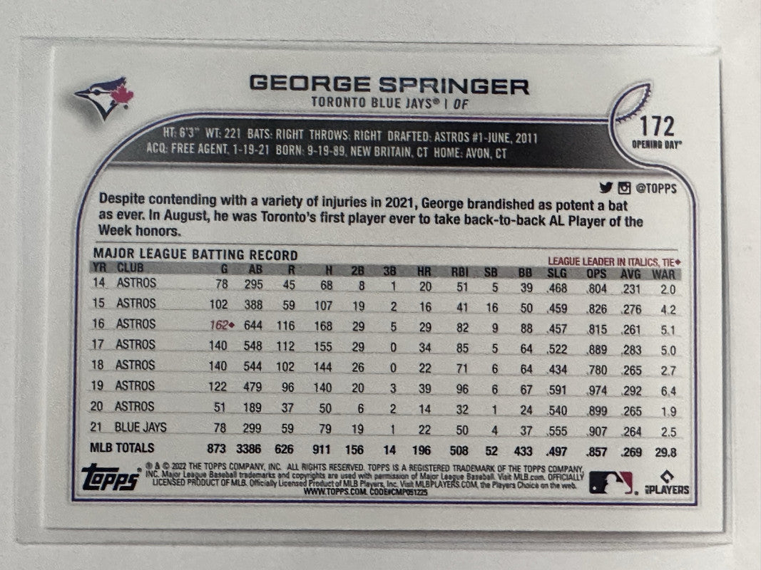#172 George Springer Toronto Blue Jays 2022 Topps Opening Day Baseball Card