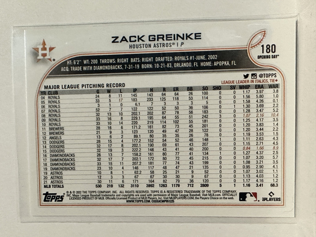 #180 Zack Greinke Houston Astros 2022 Topps Opening Day Baseball Card