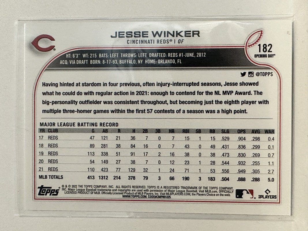 #182 Jesse Winker Cincinnati Reds 2022 Topps Opening Day Baseball Card