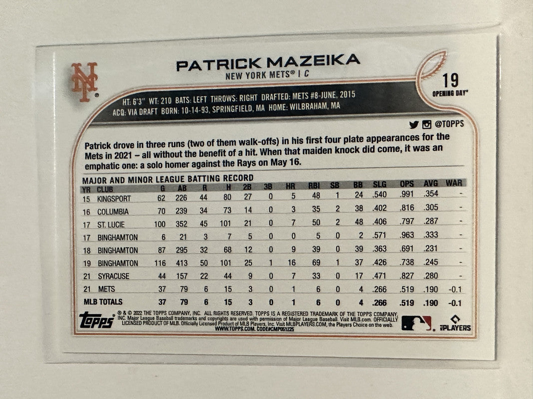 #19 Patrick Mazeika Rookie New York Mets 2022 Topps Opening Day Baseball Card