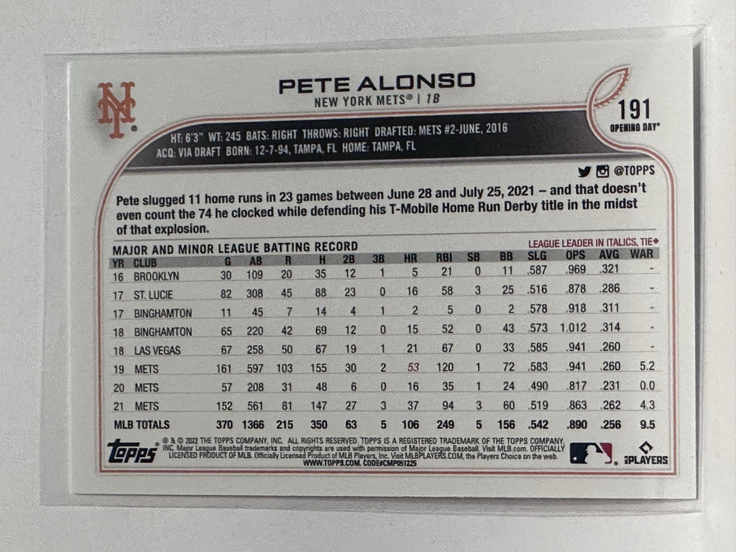 #191 Pete Alonso New York Mets 2022 Topps Opening Day Baseball Card