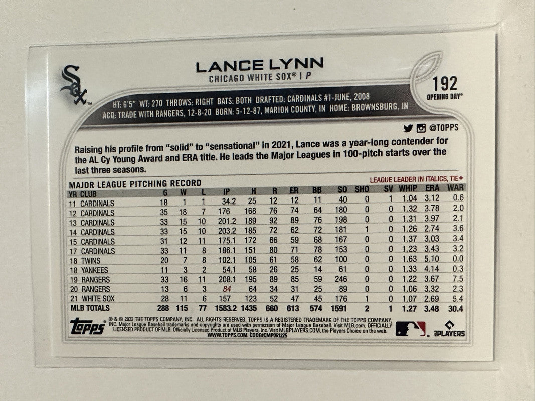 #192 Lance Lynn Chicago White Sox 2022 Topps Opening Day Baseball Card