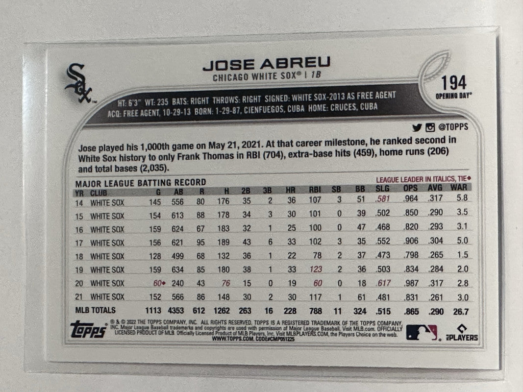 #194 Jose Abreu Chicago White Sox 2022 Topps Opening Day Baseball Card