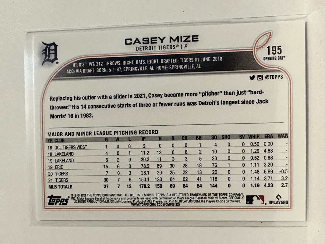 #195 Casey Mize Detroit Tigers 2022 Topps Opening Day Baseball Card
