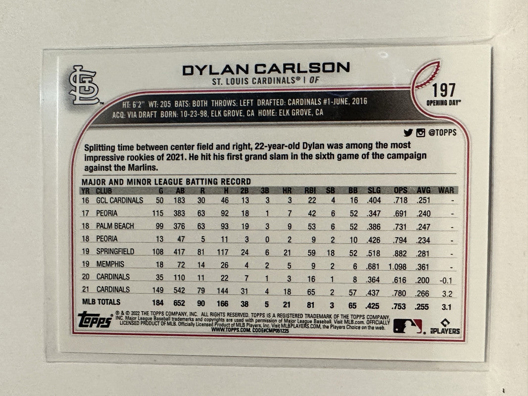 #197 Dylan Carlson All Star Rookie St Louis Cardinals 2022 Topps Opening Day Baseball Card