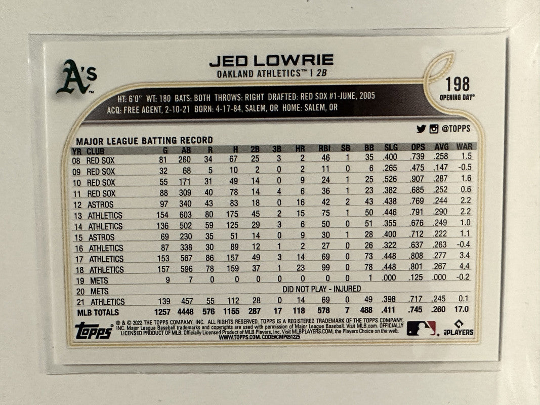 #198 Jed Lowrie Oakland Athletics 2022 Topps Opening Day Baseball Card